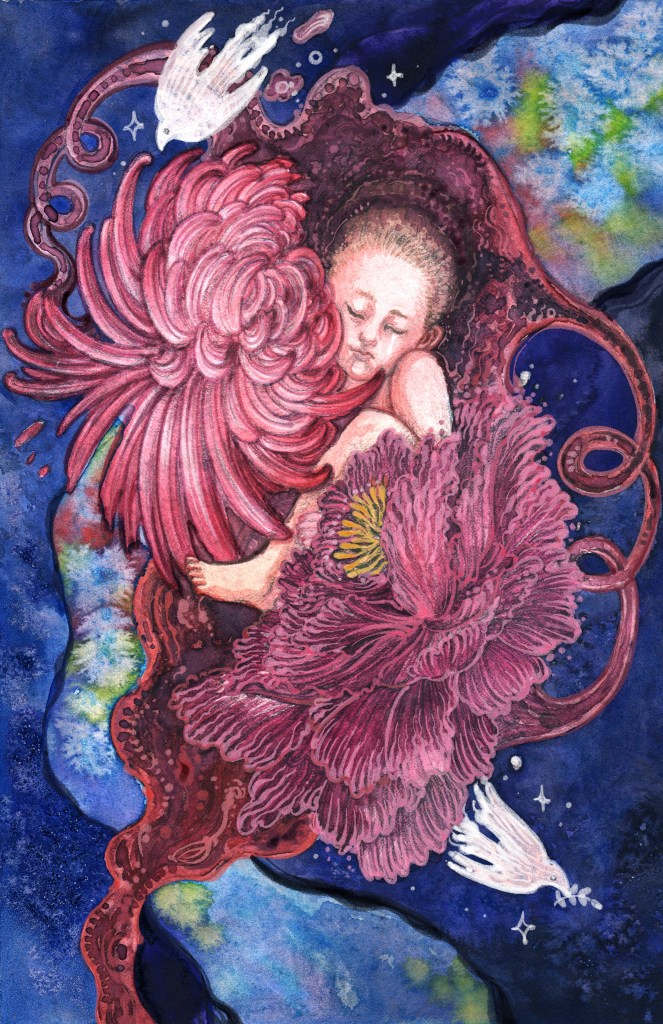 The tenth illustration depicts Erikson’s eighth and final stage of development, Ego Integrity versus Despair, which applies to old age (ages 65 years and beyond until death). During this stage, the primary task for older individuals is to reflect upon and accept their life’s journey. In my tenth illustration, the war orphan has become an elderly man, contemplating his life. I intentionally incorporated the same design elements of a chrysanthemum and a peony from my first illustration, creating a visual echo between the two. Furthermore, I deliberately chose a smaller size of 11″x15″ for the tenth illustration compared to the other nine pieces. This was a deliberate decision to give this final artwork a distinct significance, serving as a punctuation mark to my project and symbolizing the conclusion of the war orphan’s life story.