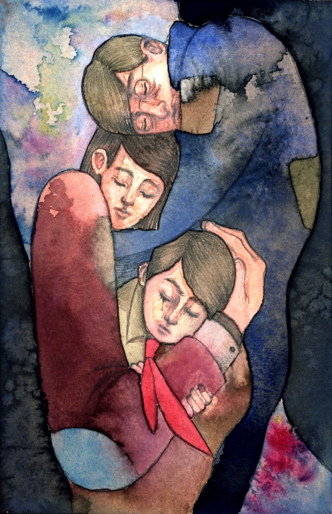 In the fifth illustration, I depicted Erikson’s fourth stage of development, Industry versus Inferiority, which applies to school-aged children (6-12 years old). During this stage, the significant relationship for children is their school. Many war orphans experienced discrimination from their Chinese peers, but they found support and protection from their Chinese parents and teachers. In my fifth illustration, I portrayed the war orphan embracing their Chinese parents to symbolize their mutual support and solidarity.