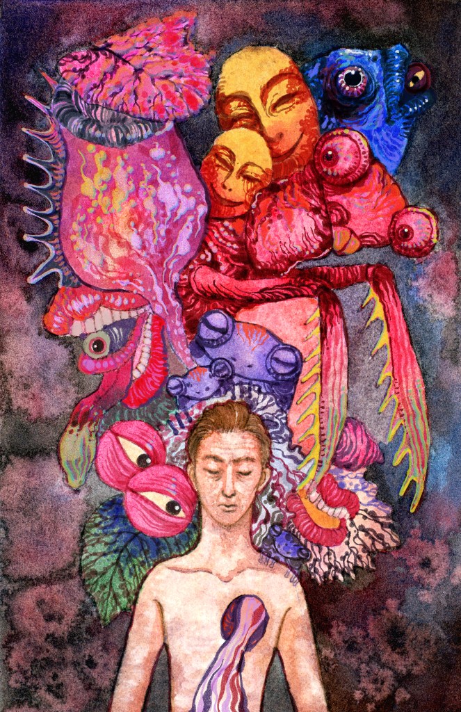 In the ninth illustration, I presented Erikson’s seventh stage of development, Generativity versus Stagnation, which pertains to middle adulthood (ages 40-64). During this stage, adults’ significant relationships encompass their social community and family. In the middle adulthood of many war orphans, they made the decision to return to Japan in search of their relatives. However, they encountered difficulties reintegrating into Japanese society due to their age. Many war orphans faced identity issues upon their return, struggling with language barriers as they were too old to relearn Japanese. Additionally, cultural barriers emerged as they had spent the majority of their lives in China. Some war orphans found themselves with no alternative but to join organized criminal gangs, such as the second-generation Japanese war orphans’ organized criminal gang known as “Doragon”. In my ninth illustration, I utilized plants and insects as symbols of identity confusion. Masks, mouths, and eyeballs were incorporated to represent their fear of being subjected to gossip.